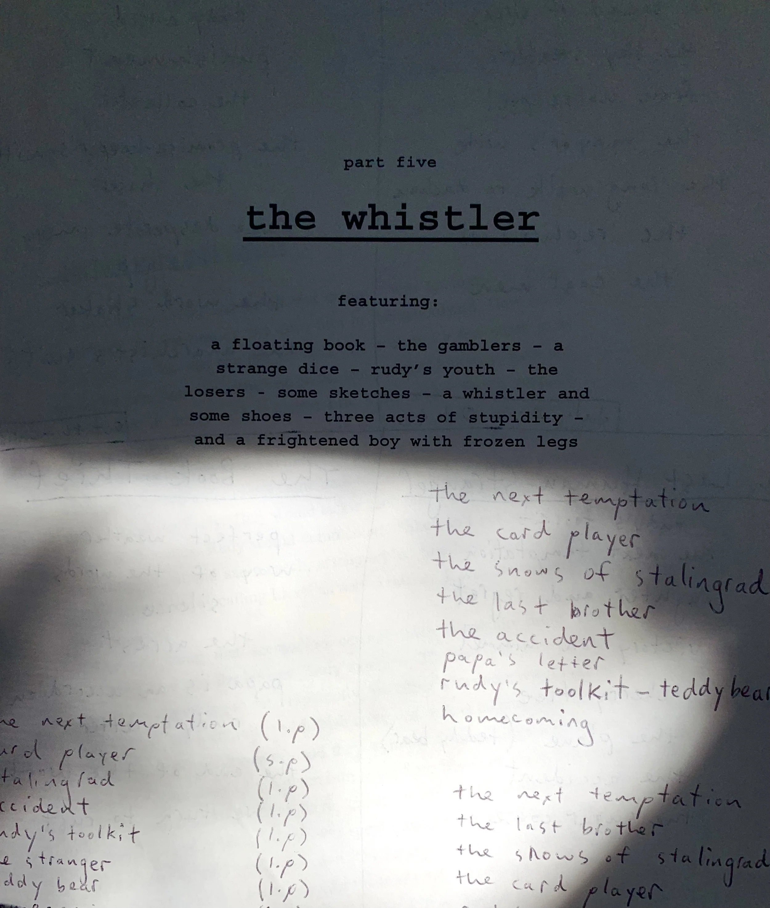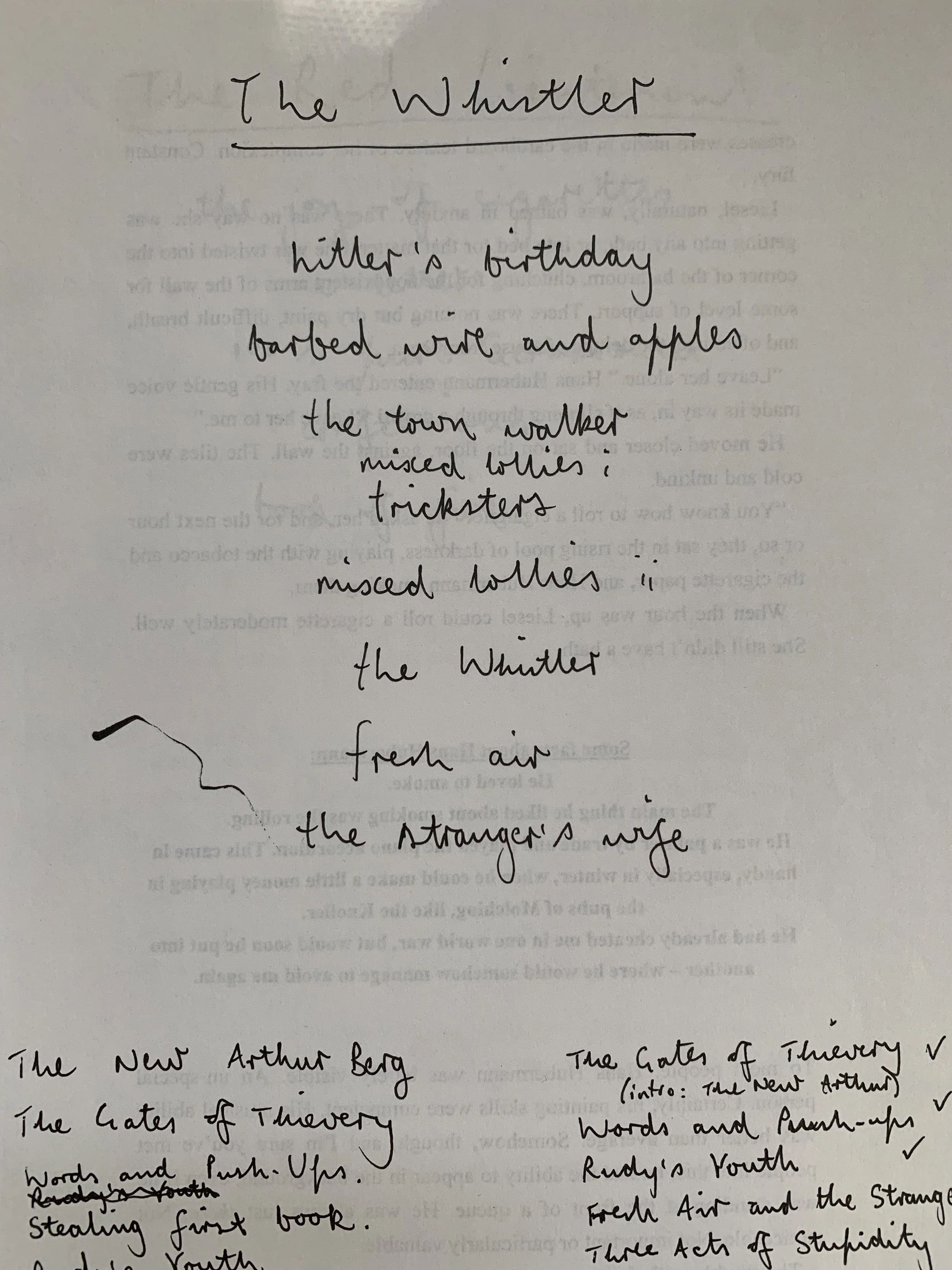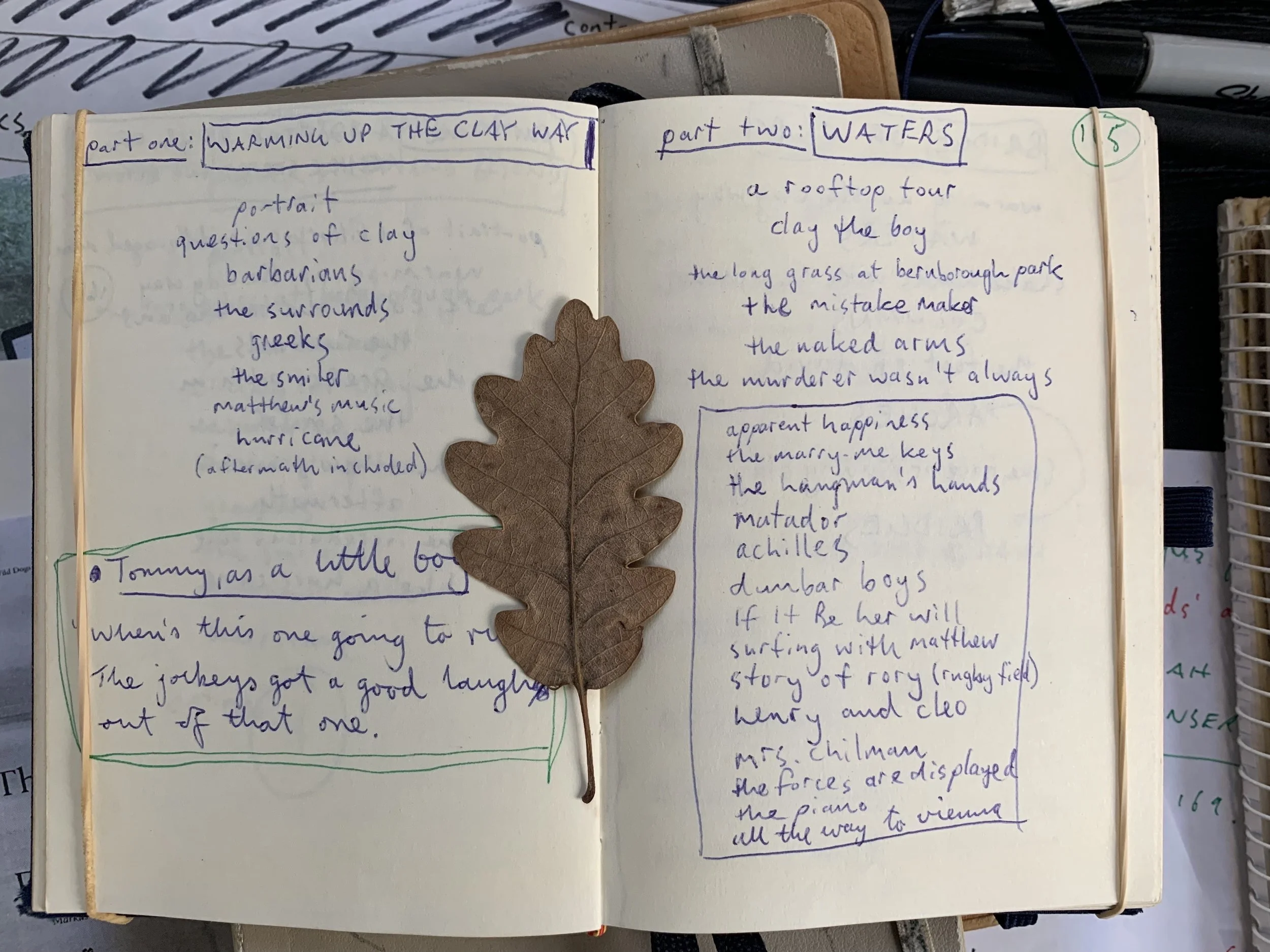 I can almost map my writing life by a procession of their quirks and colours. Inside are random ideas and attempts at new routines. But above all else, there are endless lists of chapter headings, charting the hopes of every project. Even when I’m nearing the end, I still write down those headings. When I’m out walking or running, or whatever else I’m doing, I’ll be listing them under my breath. It keeps me near the book – my stepping stones to being there.