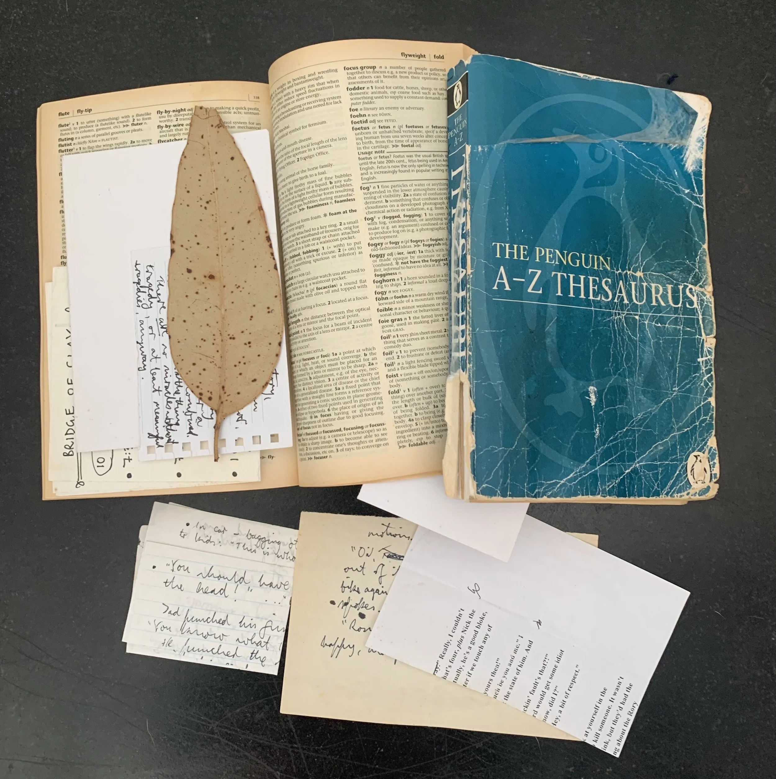 Other trusty devices (so to speak) are a beat-up dictionary and thesaurus. The thesaurus is a wonderfully strange animal. It’s best utilised as a word leading me to another word, to another again, until I find the suitably not-quite-right usage I’m looking for. Even then, that might still be just a placeholder for what’s looming in my subconscious. The right word is floating around somewhere, and there’s working for it, but also waiting. There’s so much I try to control, but I’m often reminded that the best part of the job is the mystery – when you spark something and think, ‘I didn’t know that was going to happen today.’